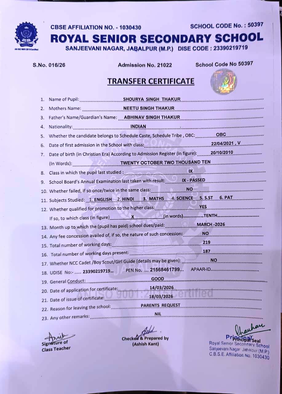 ROYAL SENIOR SECONDARY SCHOOL, Sanjeevani Nagar, J.D.A. Scheme No. 06, Jabalpur (MP) 482003, Cell. : +91-9993204840, Phone : +91-761-2423344