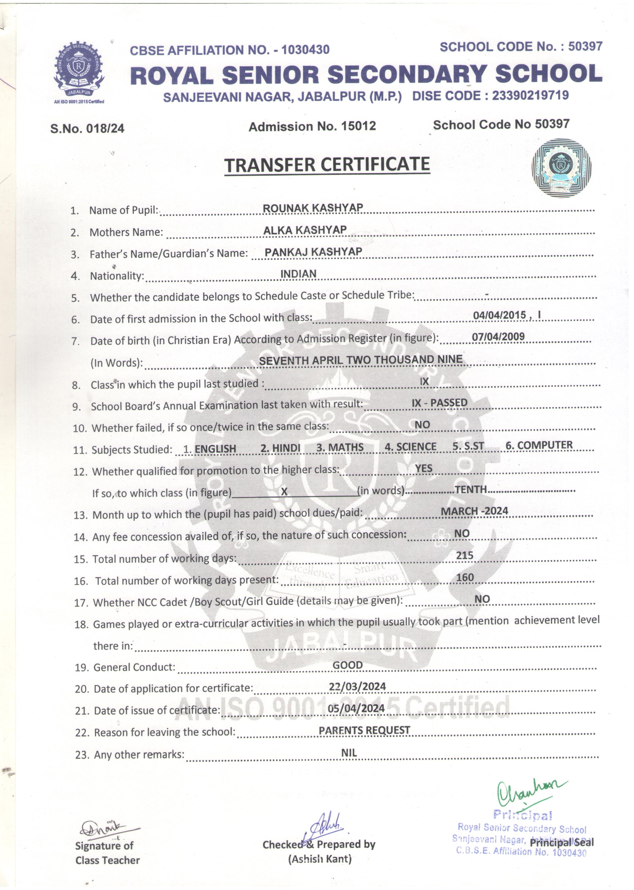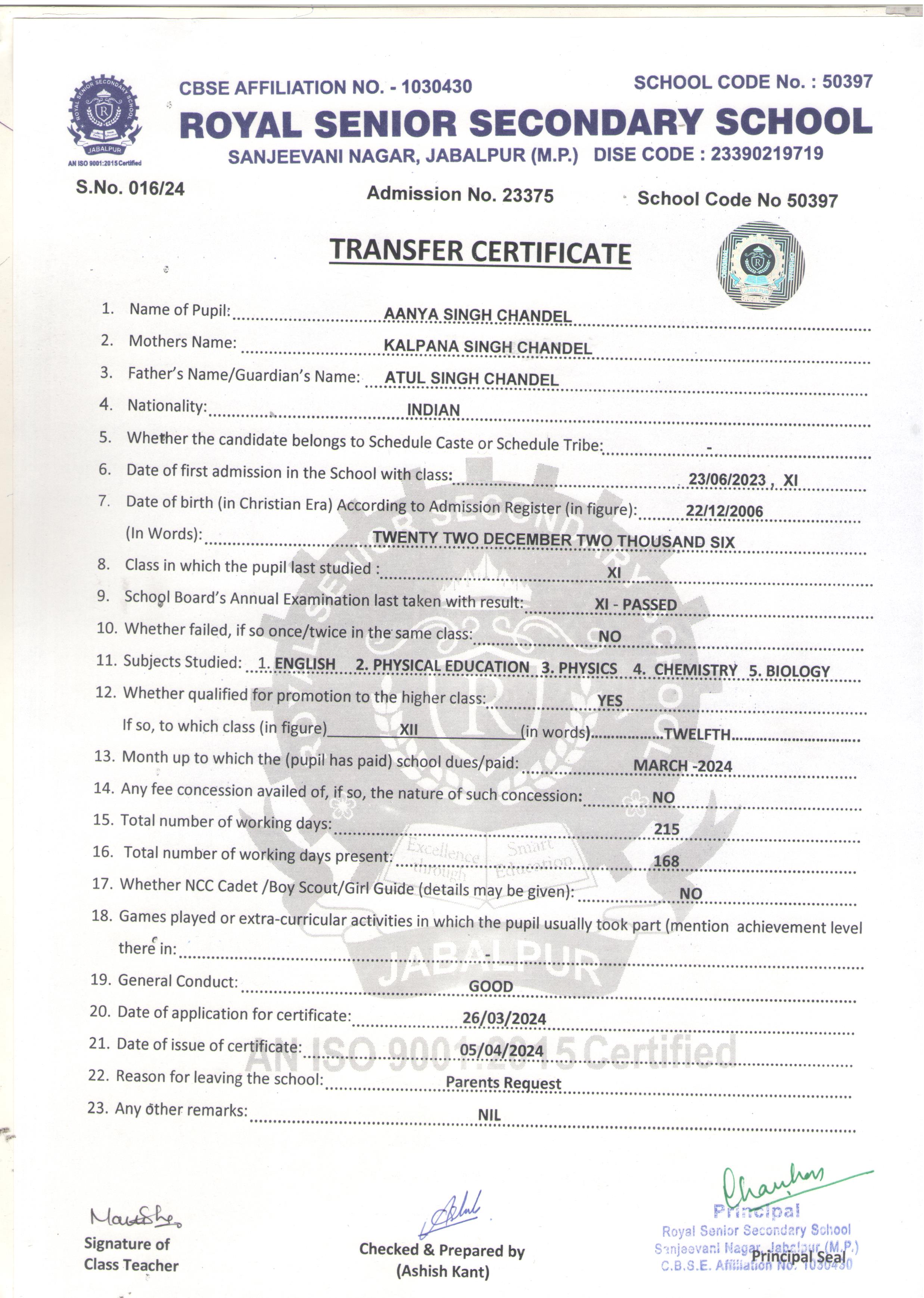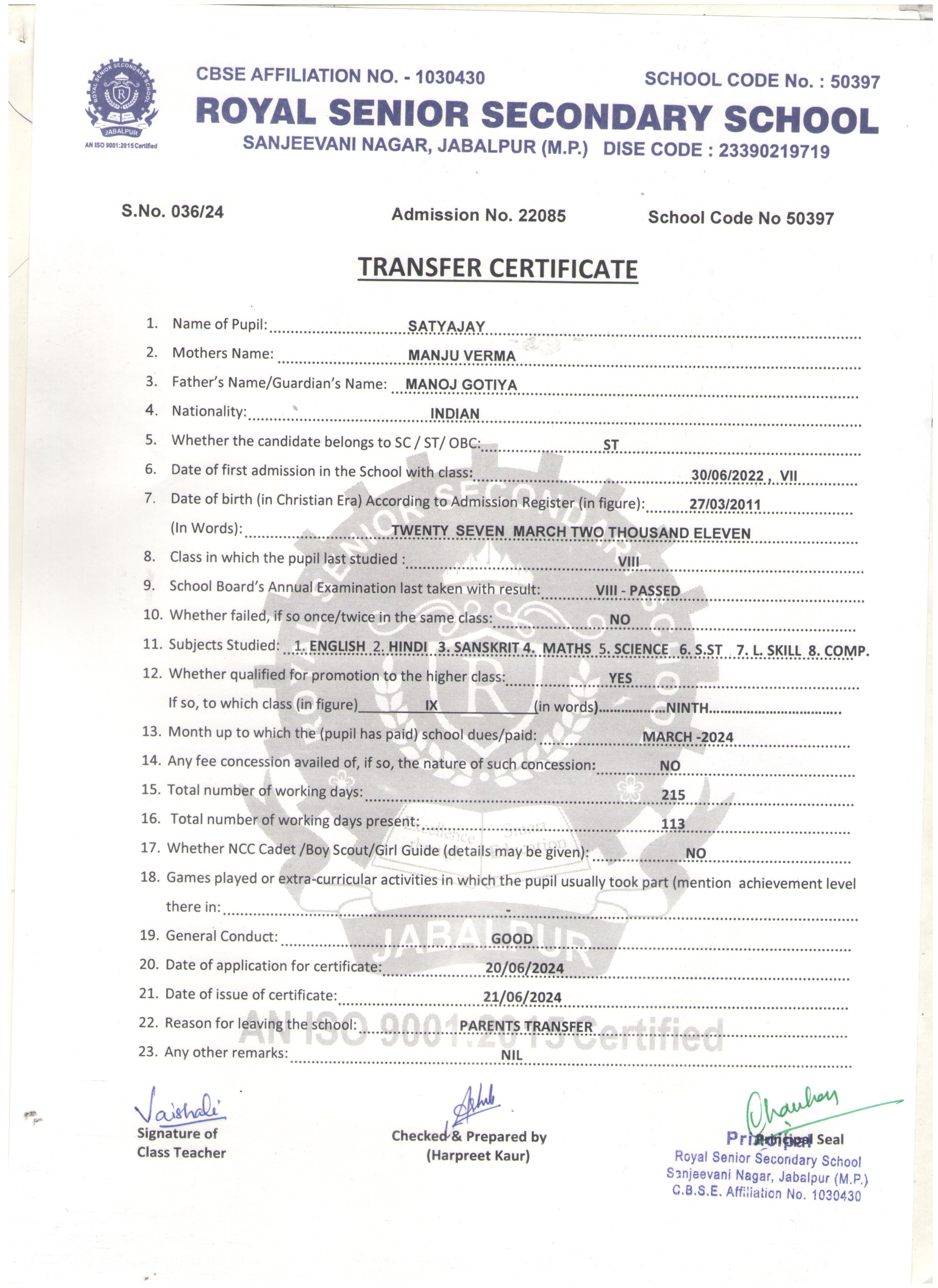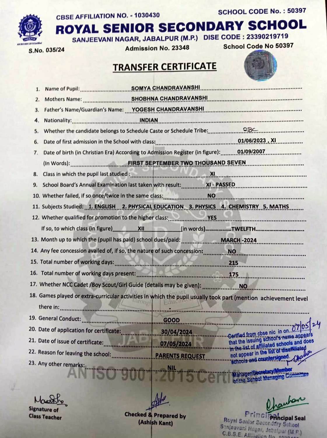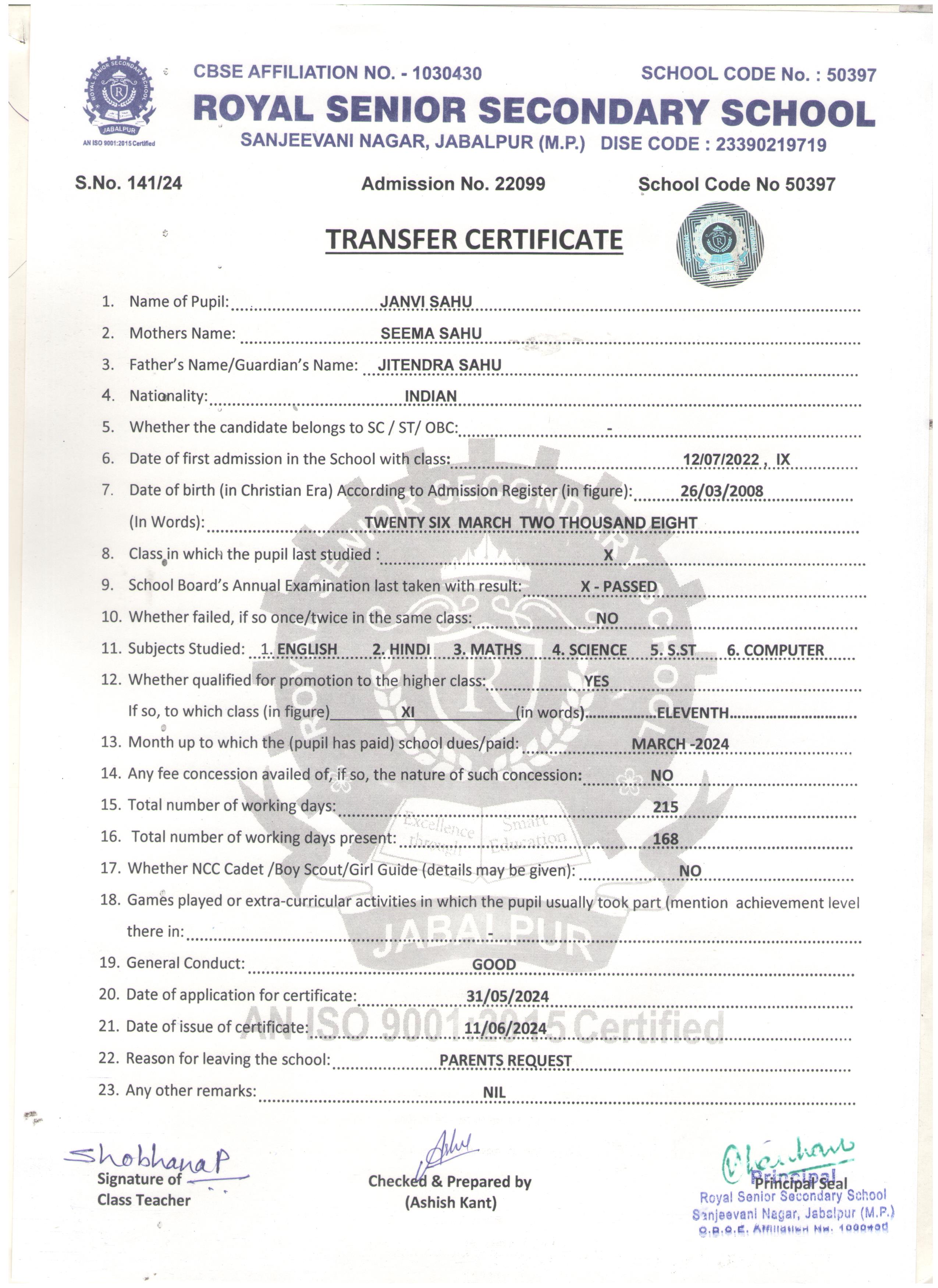 ROYAL SENIOR SECONDARY SCHOOL, Sanjeevani Nagar, J.D.A. Scheme No. 06, Jabalpur (MP) 482003, Cell. : +91-9993204840, Phone : +91-761-2423344