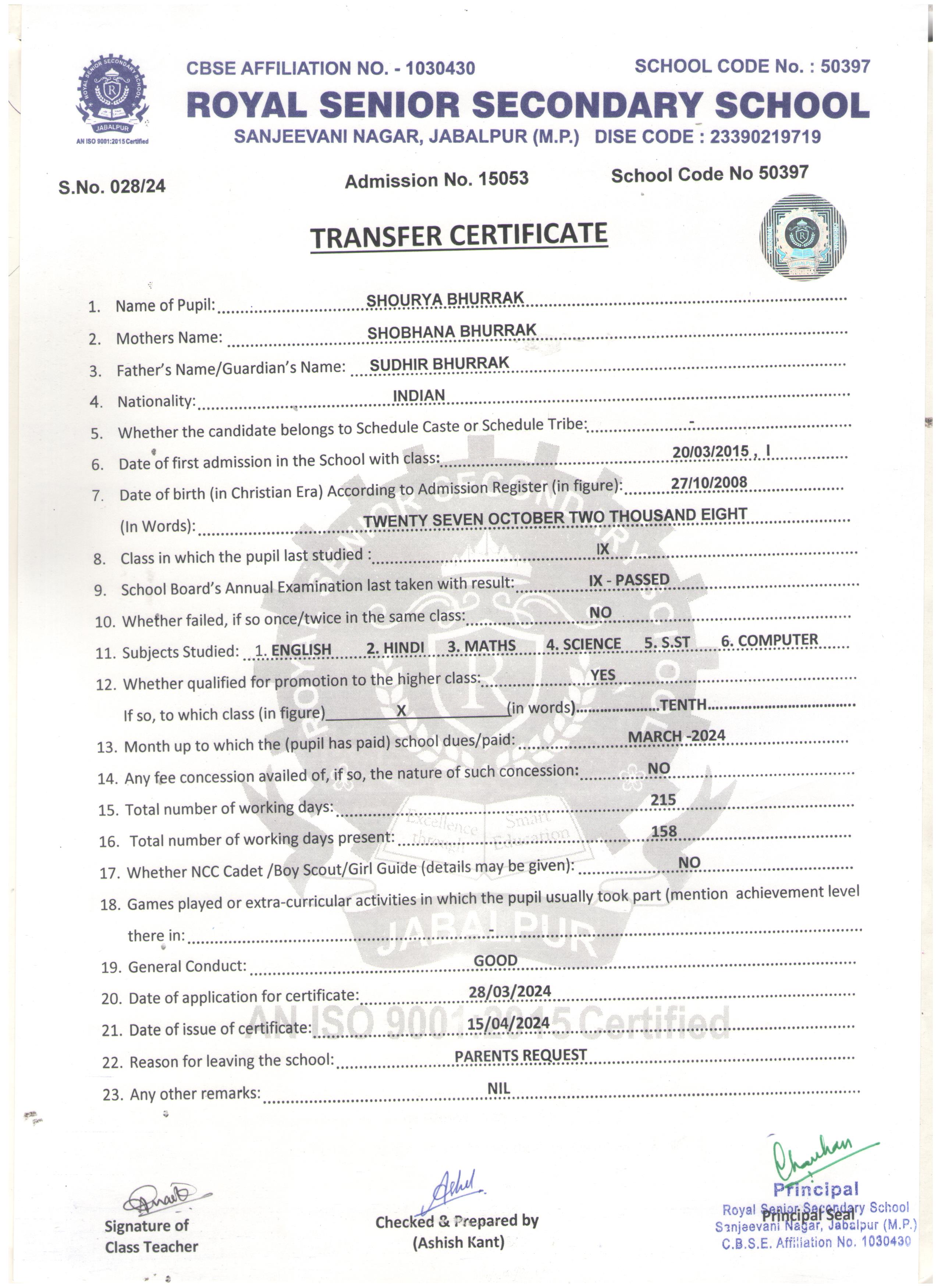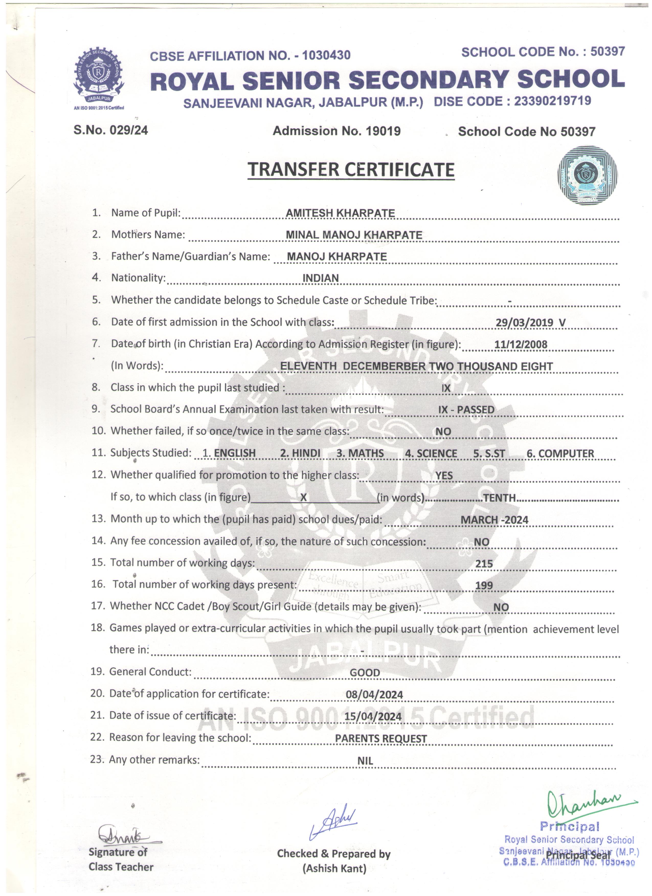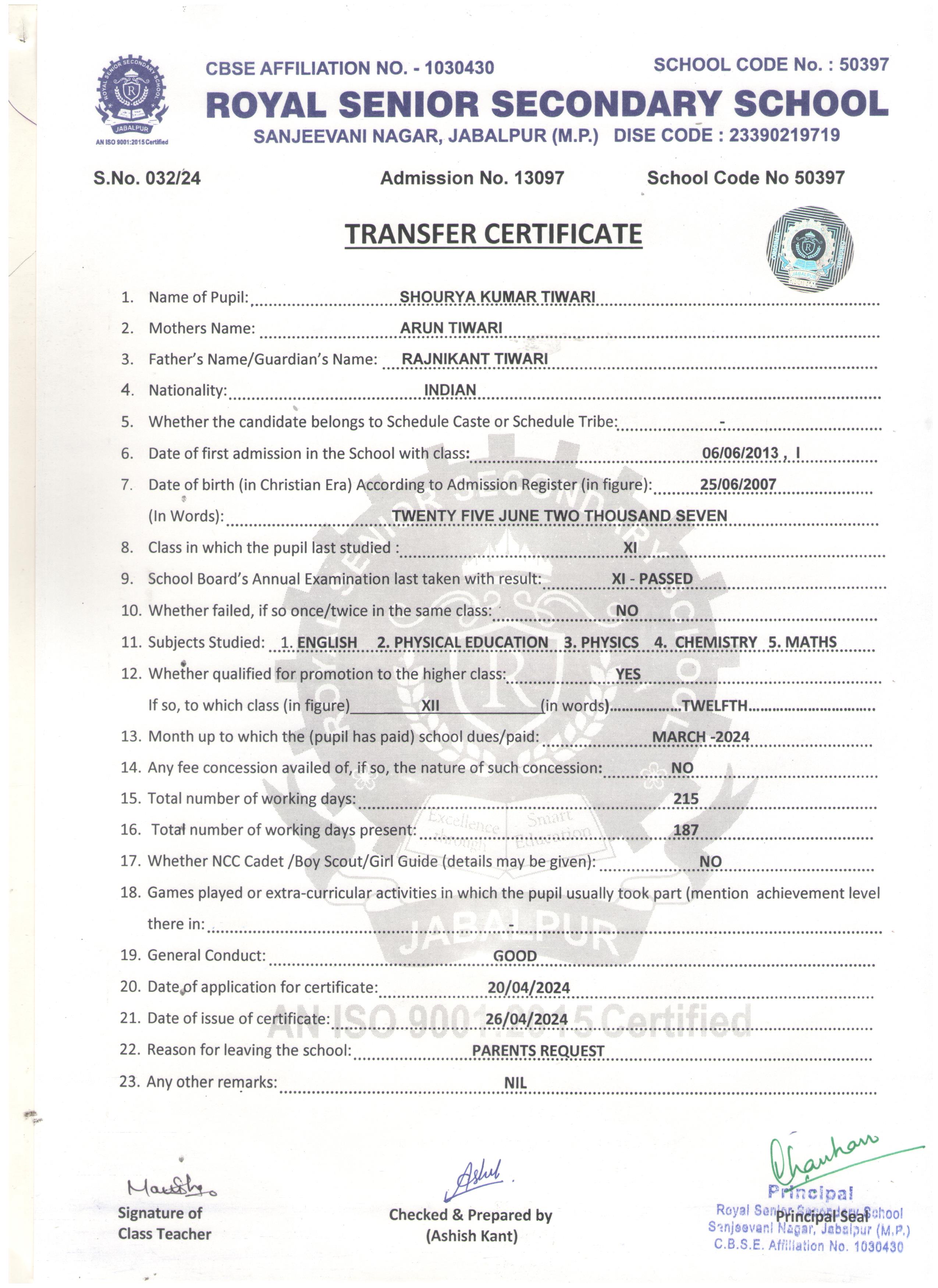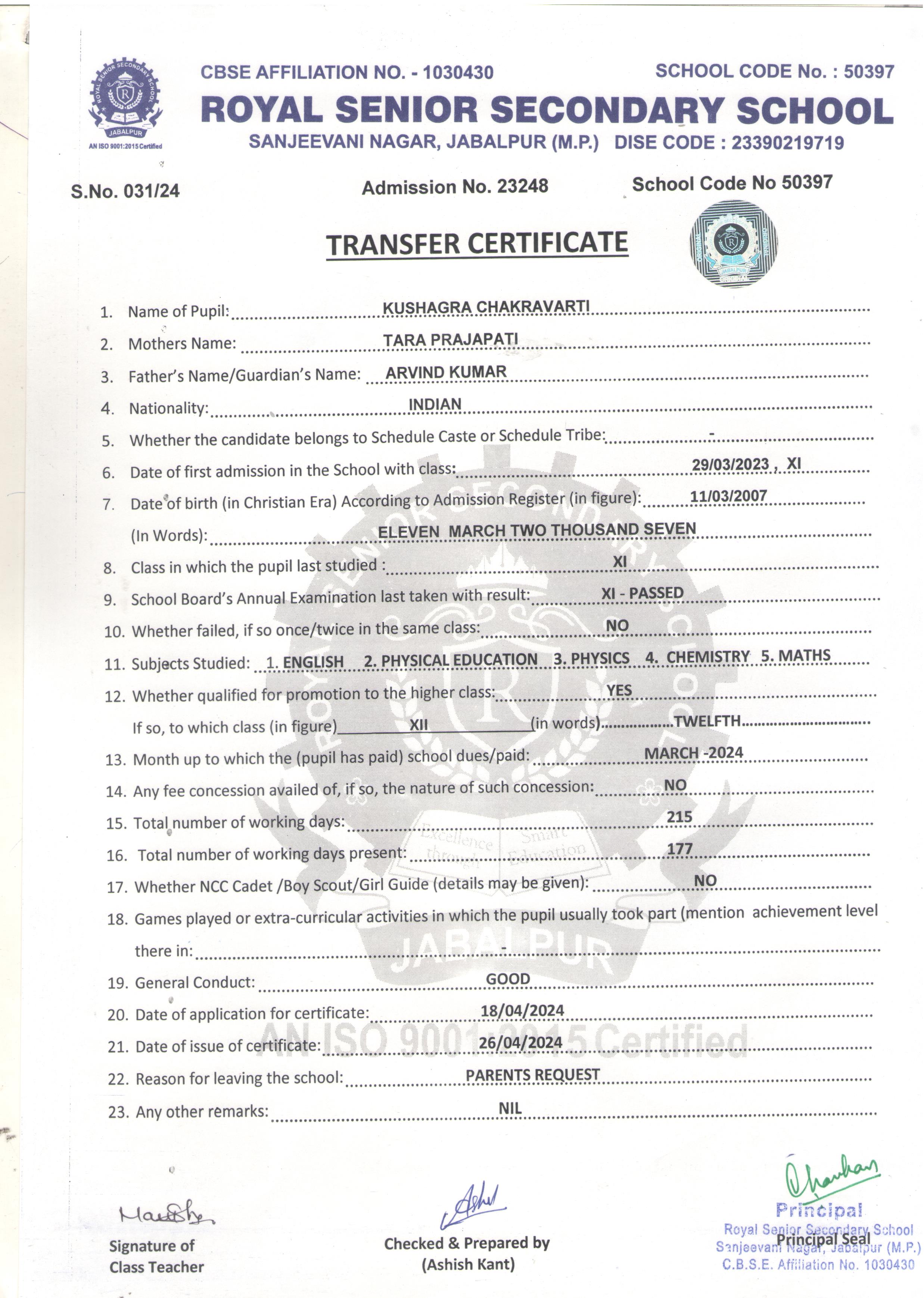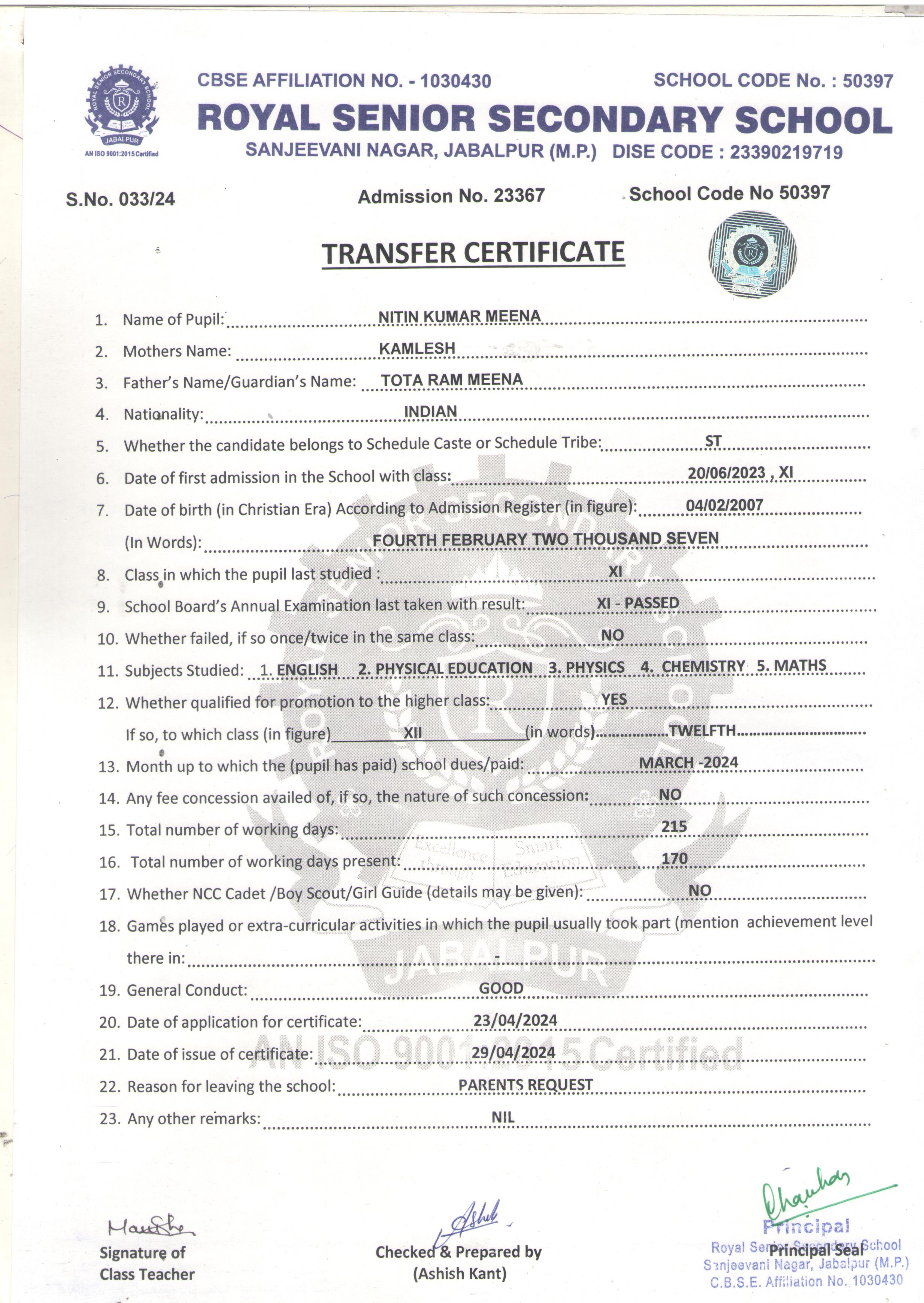 ROYAL SENIOR SECONDARY SCHOOL, Sanjeevani Nagar, J.D.A. Scheme No. 06, Jabalpur (MP) 482003, Cell. : +91-9993204840, Phone : +91-761-2423344