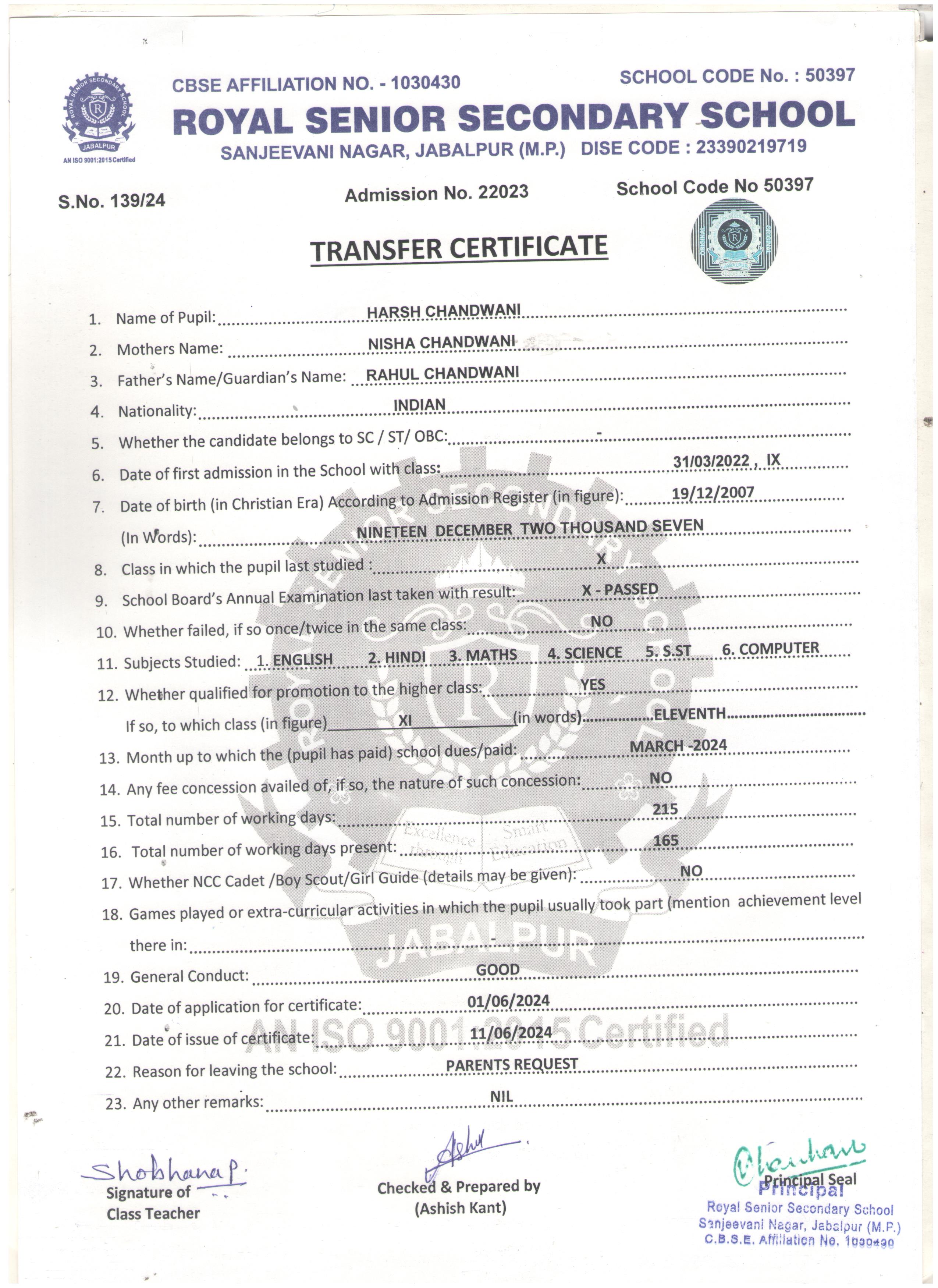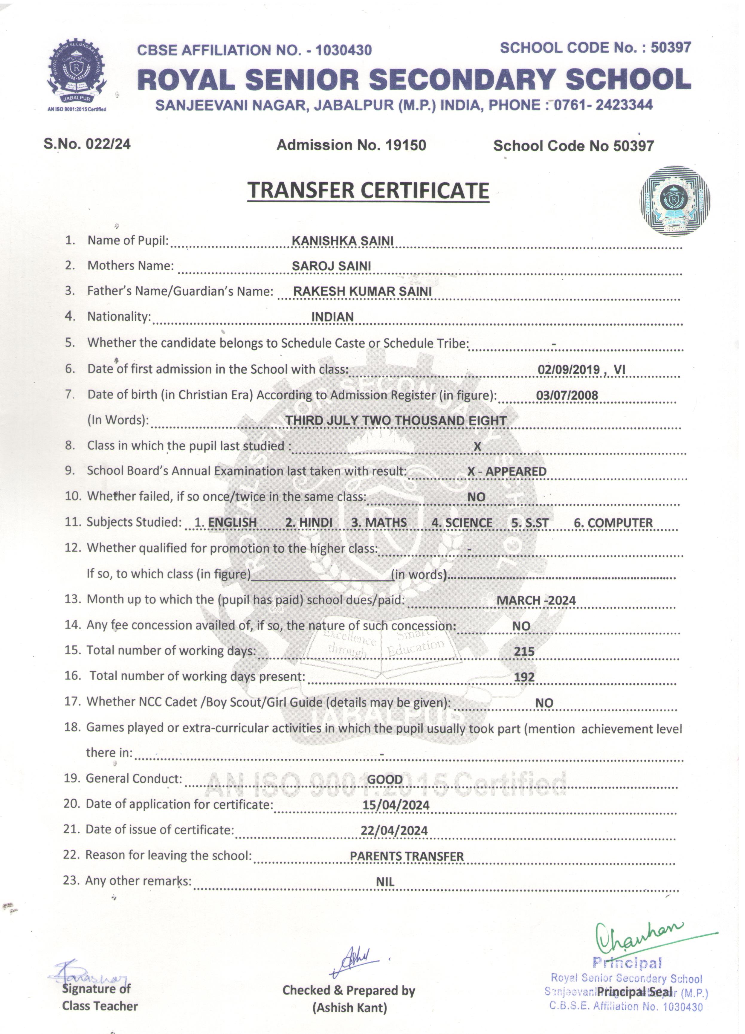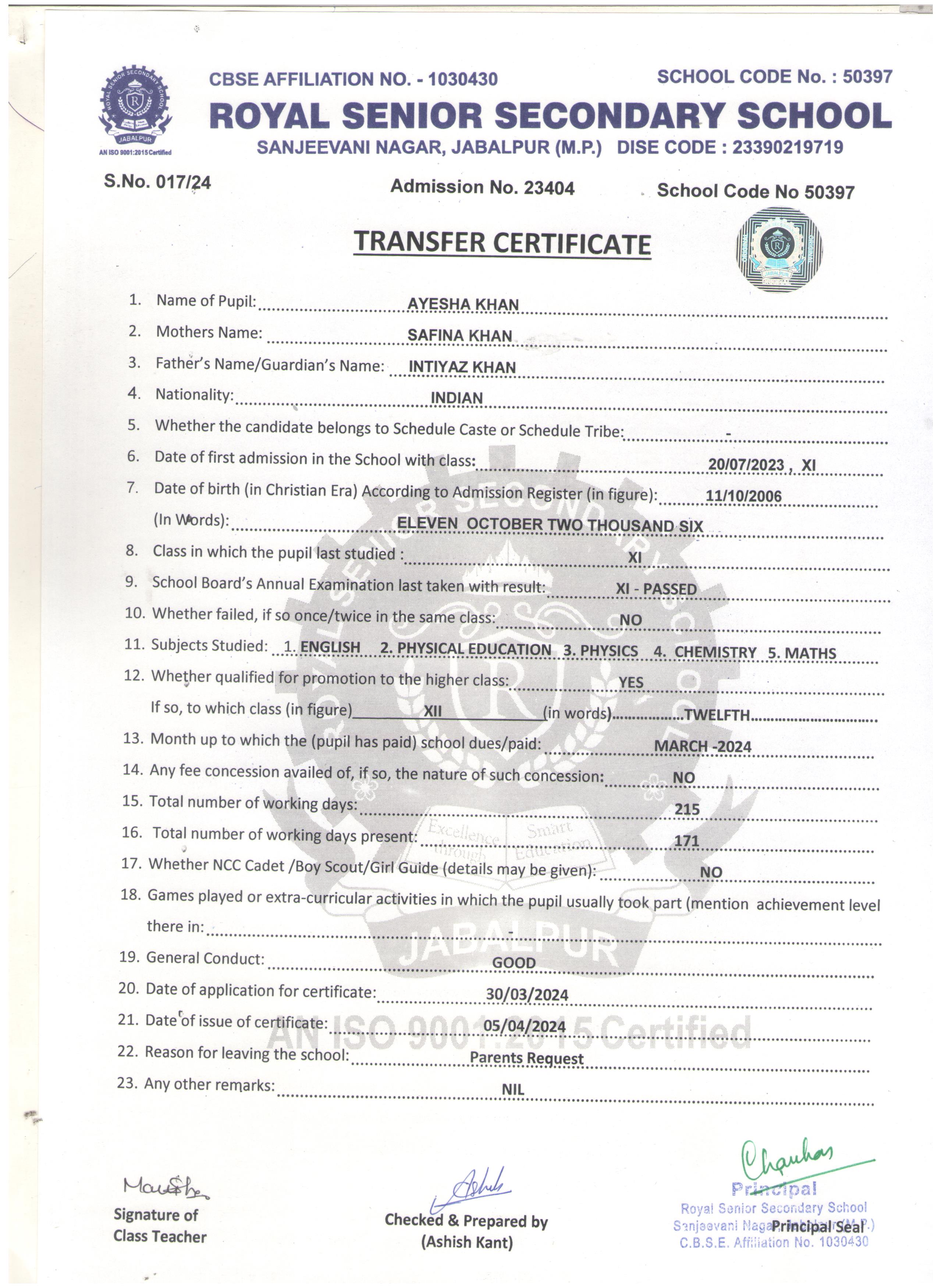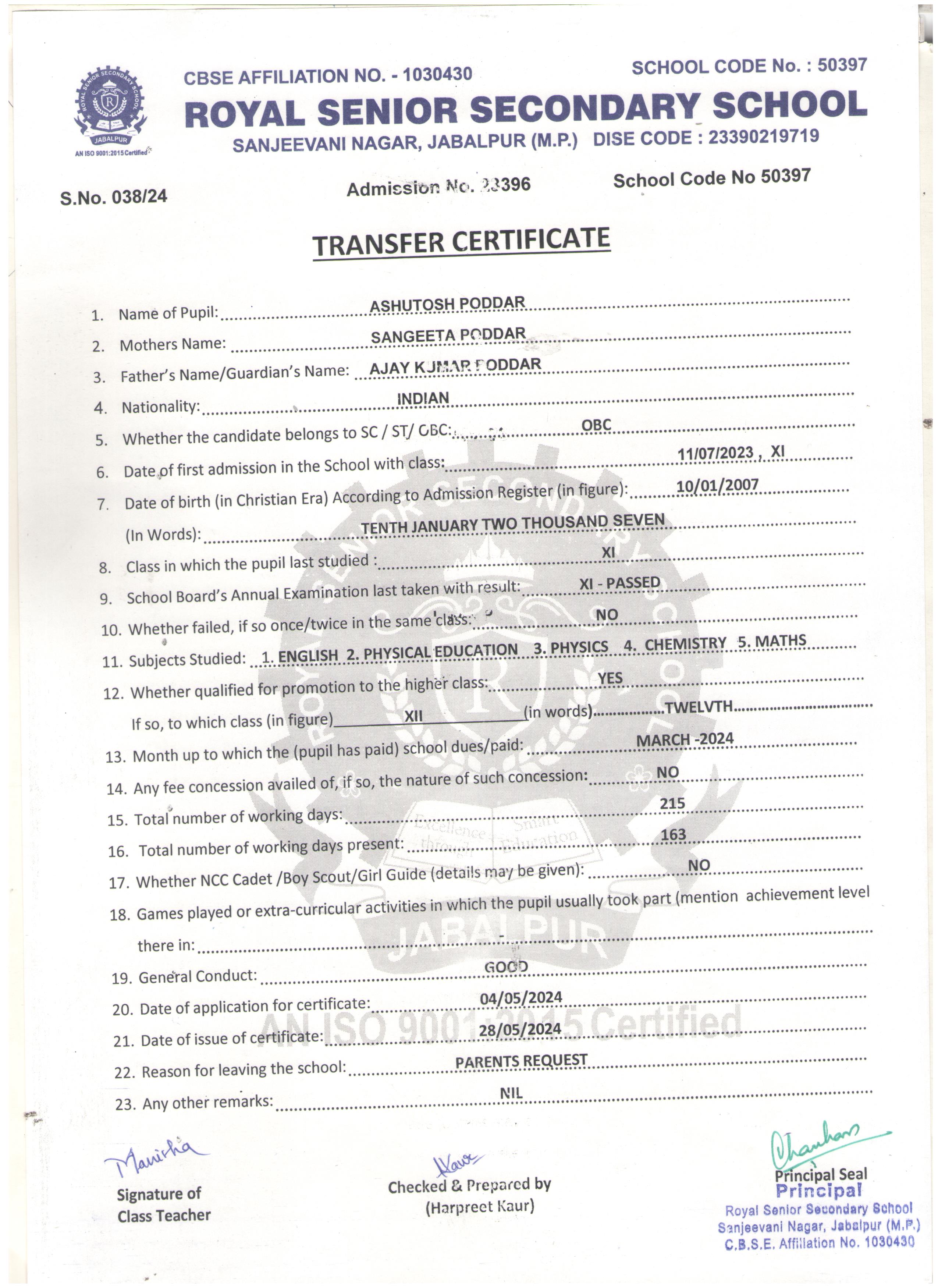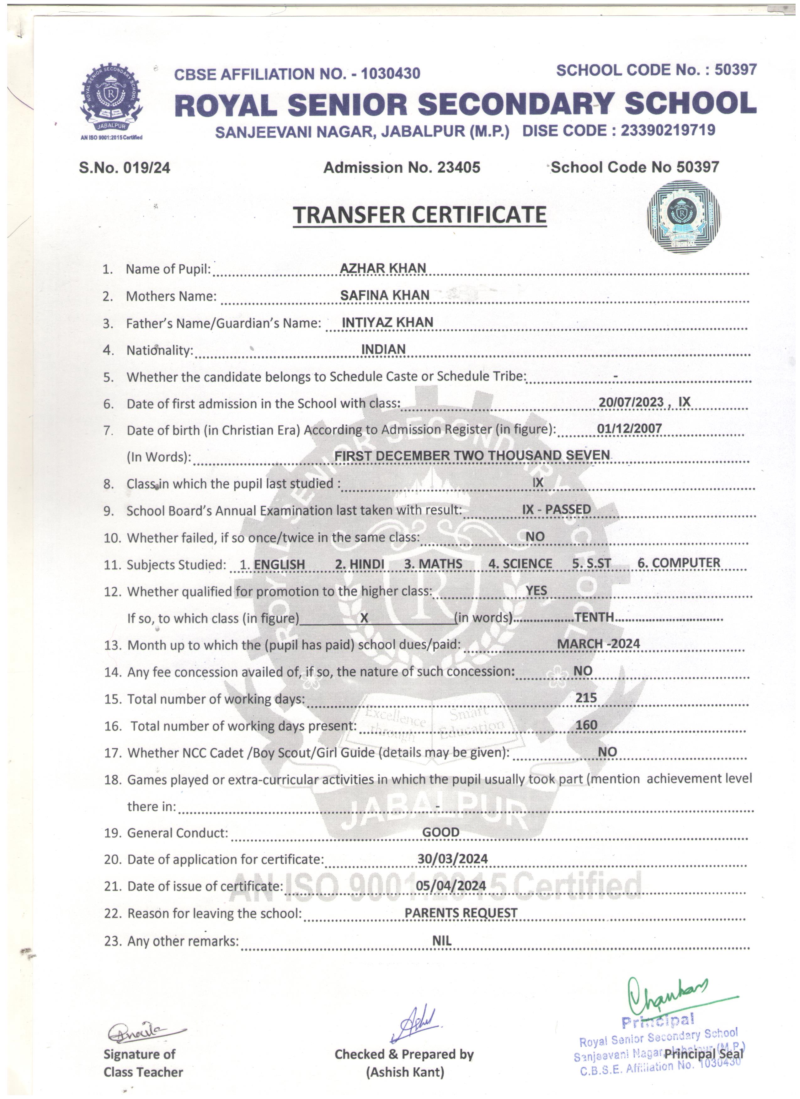 ROYAL SENIOR SECONDARY SCHOOL, Sanjeevani Nagar, J.D.A. Scheme No. 06, Jabalpur (MP) 482003, Cell. : +91-9993204840, Phone : +91-761-2423344